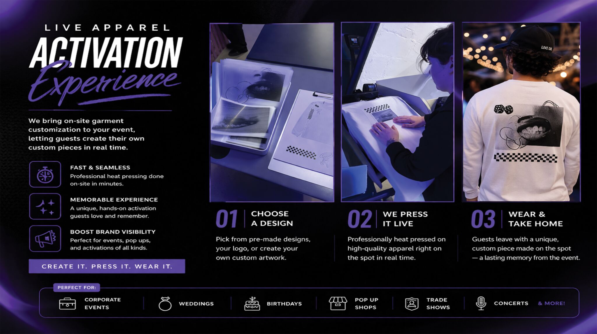 Turn any event into an unforgettable, interactive experience with our live apparel activation services. We bring on-site garment customization directly to your event, allowing guests to create their own custom clothing in real time.
